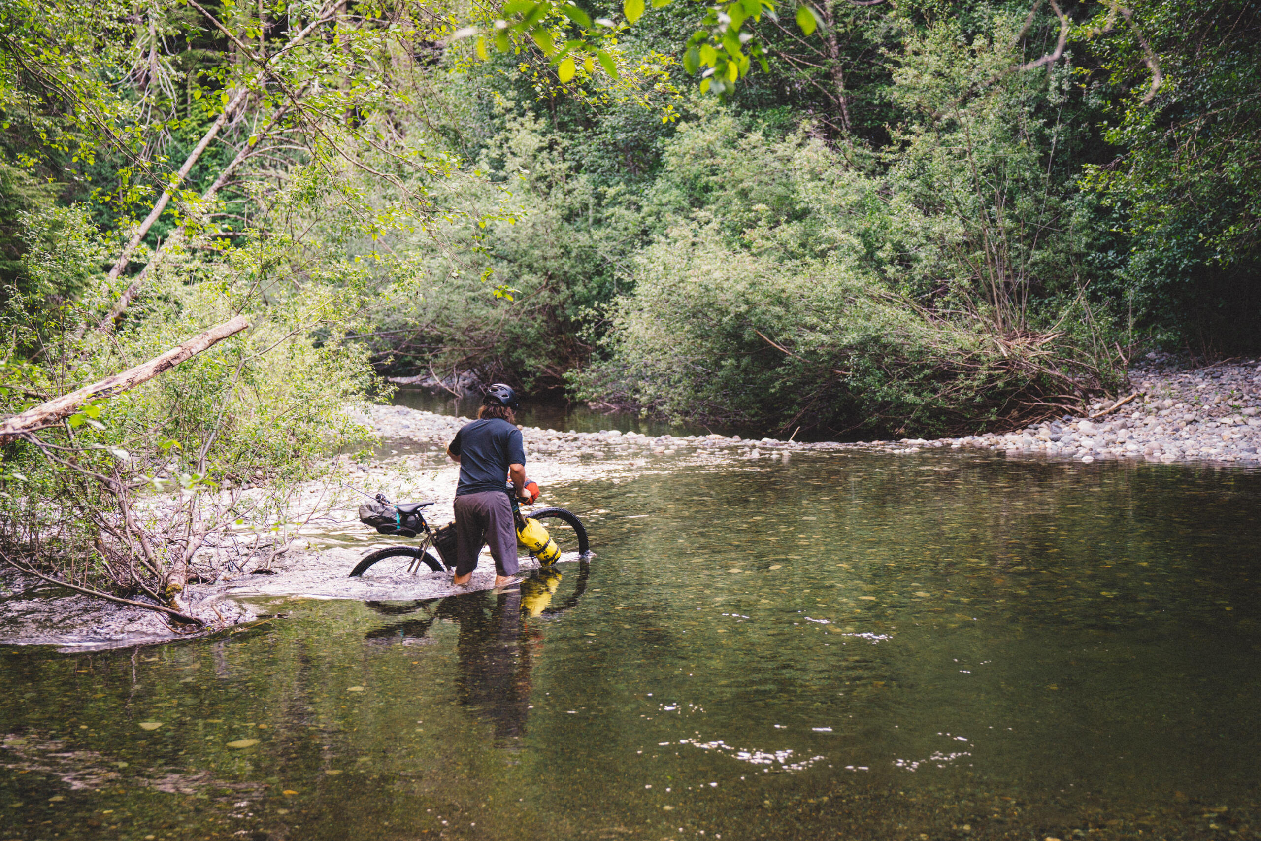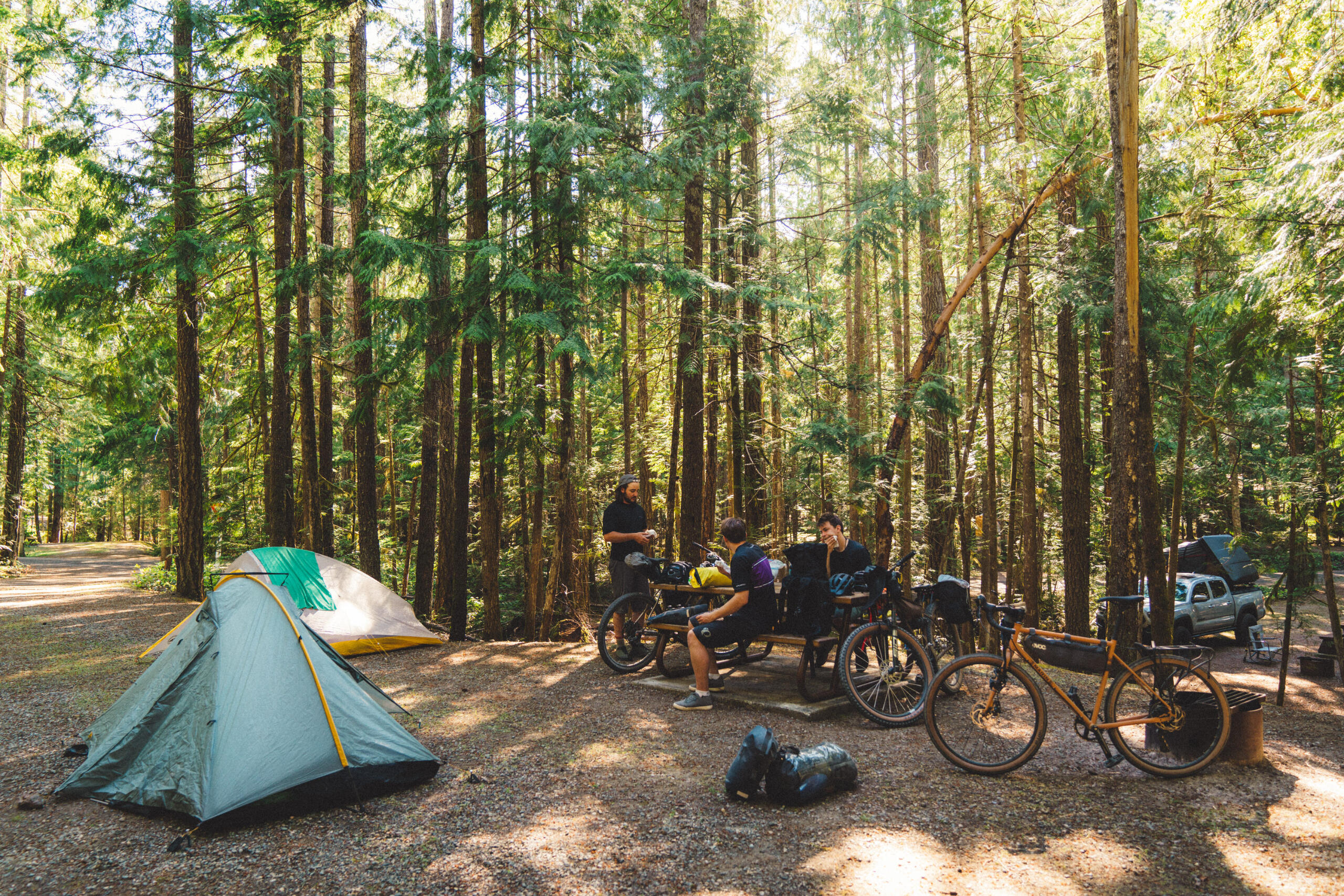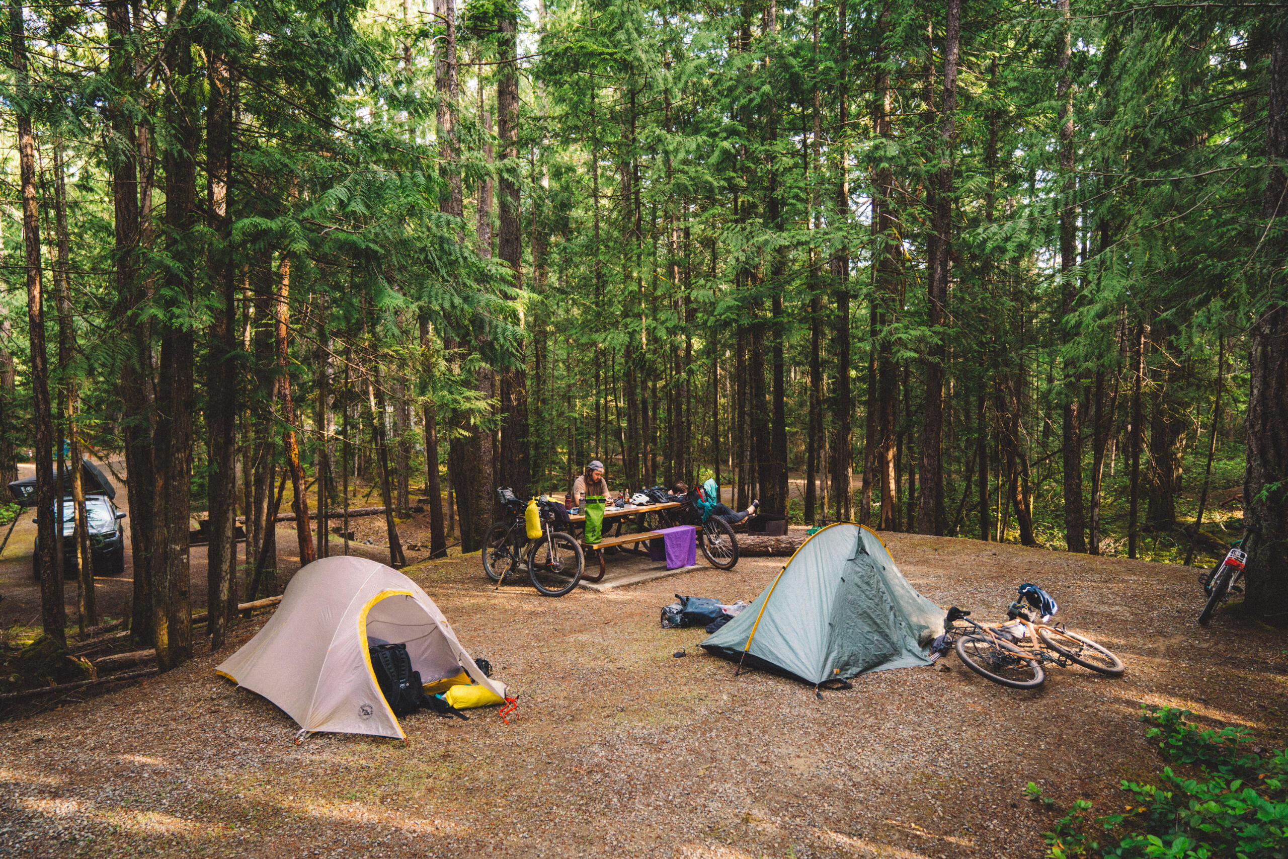 After an arduous climb pushing our bikes loaded with camping gear up a surprisingly steep gravel road in the hot June sun, the four of us took a much-needed break leaning against a logging company’s Caterpillar excavator parked for the weekend. Once we’d started pedaling about four hours earlier, the beginning of our bikepacking trip had gone surprisingly smoothly, even including a section of unexpectedly paved road. While the sudden monument of a hill had quickly ended the breeziness of the expedition, we didn’t realize that we were only beginning an onslaught of difficulties to come.In what may have been a bad omen, the troubles actually began before we departed, when one of our bikes was crushed being run over by a pickup when Jack (a great long-time friend) left it on the side of his driveway, concealed from the pickup driver by long grass. Needless to say, the bike was a write-off, and Grant (great friend and owner of Cowichan Cycles) scrambled to find a replacement in time. Luckily, he was able to source something, and on Saturday we loaded up our bikes with camping gear at the bike shop and headed out to begin our journey, being dropped off by Jack’s dad (shout out to Walt) at Kissinger Lake, just past Cowichan Lake.I had taken it upon myself to pick a route for us, and out of the options I presented, Grant, Jack, and Grant’s little brother, Luke (another great friend), agreed that following a network of logging roads from Cowichan Lake to Cameron Lake near Port Alberni would be our goal, stopping for a night at a remote mountain lake to hang out and wash a few lures. While the route looked simple and fairly easy when reviewed on online maps, the reality was quite different.Before the great hill, about three hours into our journey, we’d stopped for a lunch break at a recently repaired bridge, washed out by incredible Autumn rains. While eating, we heard a motor approaching in the distance, and a motorcyclist stopped to chat, asking where we were headed. After telling him, he asked if we’d done the route before. Replying that we hadn’t, he warned that the section beyond the top of the hill was impassable via truck, may-as-well-be impossible via motorbike, just possible on foot, and debatably so with bicycles. While we exchanged nervous looks between us, he rode off, saying he was going to assess it for himself. Quite some time later, he returned, saying the road was near completely overgrown with alders, and a large trench had formed down the middle of the 'road' due to erosion. Already hours in, we decided to push ahead up the big hill—pun intended.After our break at the excavator, we began attacking the overgrown and washed-out road. A narrow animal path cut through the alders, along the edge of the 4ft deep eroded trench. Bear scat, some fresh, lined the path, and the idea of riding was impossible, as fallen alders were everywhere, whether directly on the ground, or crisscrossing. We heaved, pushed, ducked, and fought our way for what seemed like an eternity, slowing our pace to a crawl, and stopping to filter water numerous times at small creeks contributing to the trench. After a couple hours of trudging, losing a water bottle and snapping a fishing rod in the process, we made it out to a real road, and took a long descent, re-inspiring us.While riding the clear roads and on a high, with Mt. Arrowsmith towering above us, we came face-to-face with a heard of elk, saw a few grouse, took a brief detour due to a wrong turn, and were then met with our next challenge: a deep and very cold river crossing, which left us numb from the fording. Drying off and taking a little break, we expected the last 10kms to the lake to be easy—we should have known better.The entirety of the last section was uphill, and took three hours, consisting of delusion, many expletives, and—being the one who'd found the route—a good amount of joy from the others noting my suffering along with them. When we finally arrived at our camp for the night beside the lake, it had been almost ten hours since we'd departed, travelling about 60kms, with just over 1200m in elevation gain. After setting up camp at the lake, we ate dinner, had a couple cans, some of us swam, and we then had a well-deserved sleep.The next morning, we had a slow start at the lake, fishing, swimming, and Grant even got in a morning nap. After packing up, we had a comparatively very easy journey for the day ahead of us, consisting of mostly downhill, well-established roads to our camp for the evening at Little Qualicum Falls Provincial Campground. However, our day wasn’t without it challenges, with some bike adjustments coming quickly after leaving the lake, and Luke blowing a tyre soon after that. With the repairs behind us, we ripped along the dirt roads, raising dust and enjoying the fruits of our uphill labour the previous day.About three hours after leaving the lake, we reached the paved Highway 4, coming out at the Port Alberni Summit. Flying down the paved highway, we reached Little Qualicum Falls about an hour later. Having set up camp, we rode our bikes to nearby Bigfoot Burgers, where we enjoyed smash burgers and some cans, stocking up to bring some back to camp. Back at the park, we headed to the river to wash the dust off, then head back to camp for a fire.The next day, Jack’s dad picked us up, and we grabbed brunch in Parksville, reflecting on the insanity of the last two days. While we had expected more actual riding as opposed to pushing, the total 117km journey, with over 1500m total elevation, and hitting a top-speed of just under 100km/hr when bombing down Hwy 4, was a rewarding test of will, marked by challenge but also marked by laughs (many at our own expense). Undeterred by past experiences, we’re in the process of arranging this year’s bikepacking trip; hopefully with better route selection.------------------Like what you read? This journal entry was supported in part by Cowichan Cycles. Ad
